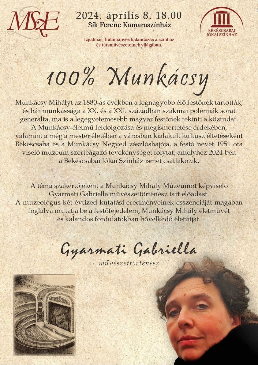 A Munkácsy 180 ünnepi év jegyében a téma szakértőjeként a Munkácsy Mihály Múzeumot képviselő Gyarmati Gabriella művészettörténész tart előadást. A muzeológus két évtized kutatási eredményeinek esszenciáját összefoglalva mutatja be a festőfejedelem, Munkácsy Mihály életművét és kalandos fordulatokban bővelkedő életútját.