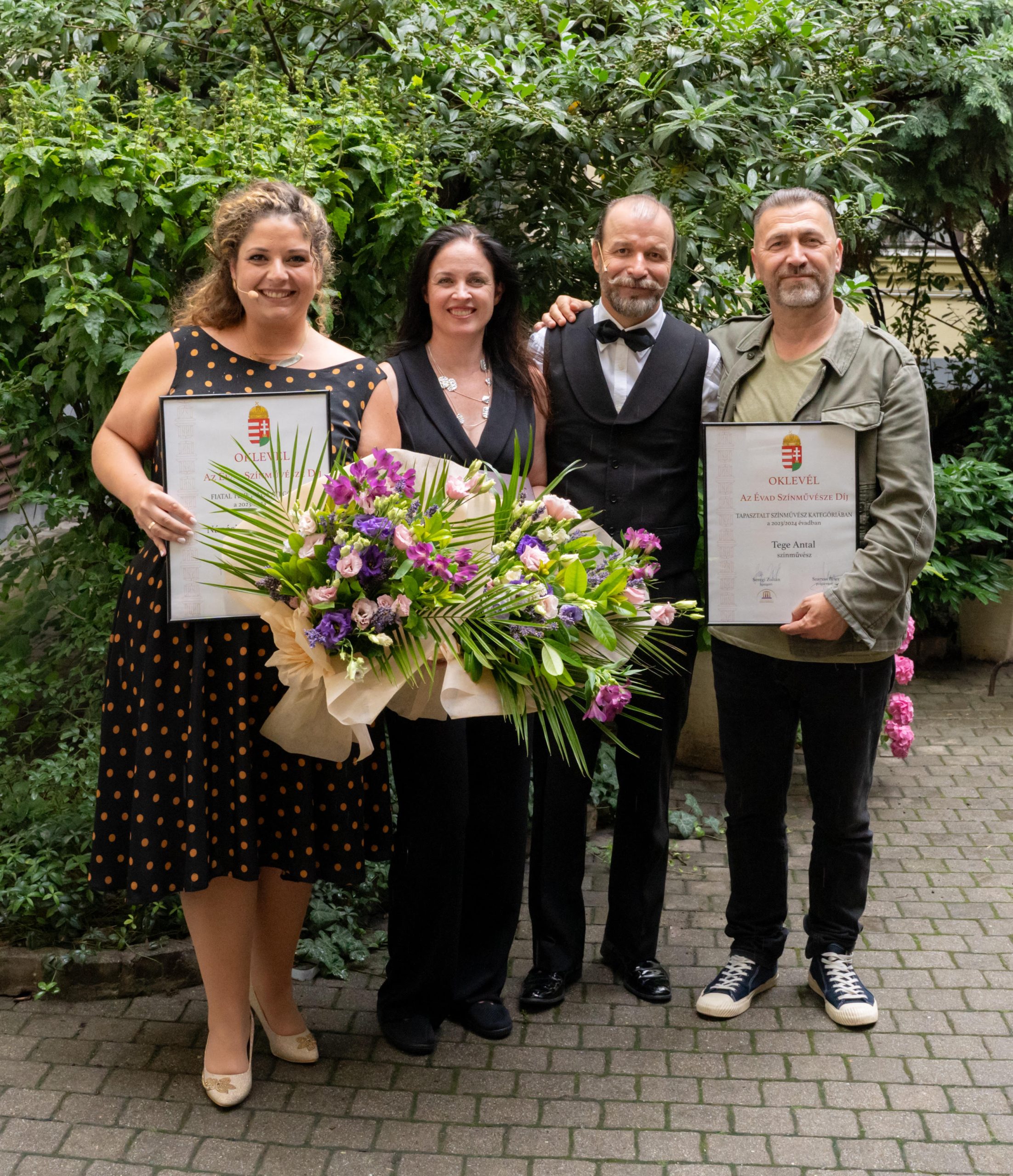A kiemelt képen a boldog díjazottak: Nánási-Veselényi Orsolya (fiatal tehetség), Tarsoly Krisztina (Gálfy gyűrű-díj), Csomós Lajos (érett színművész) és Tege Antal (tapasztalt színművész). Fotó: lackasphoto /jokaiszinhaz.hu