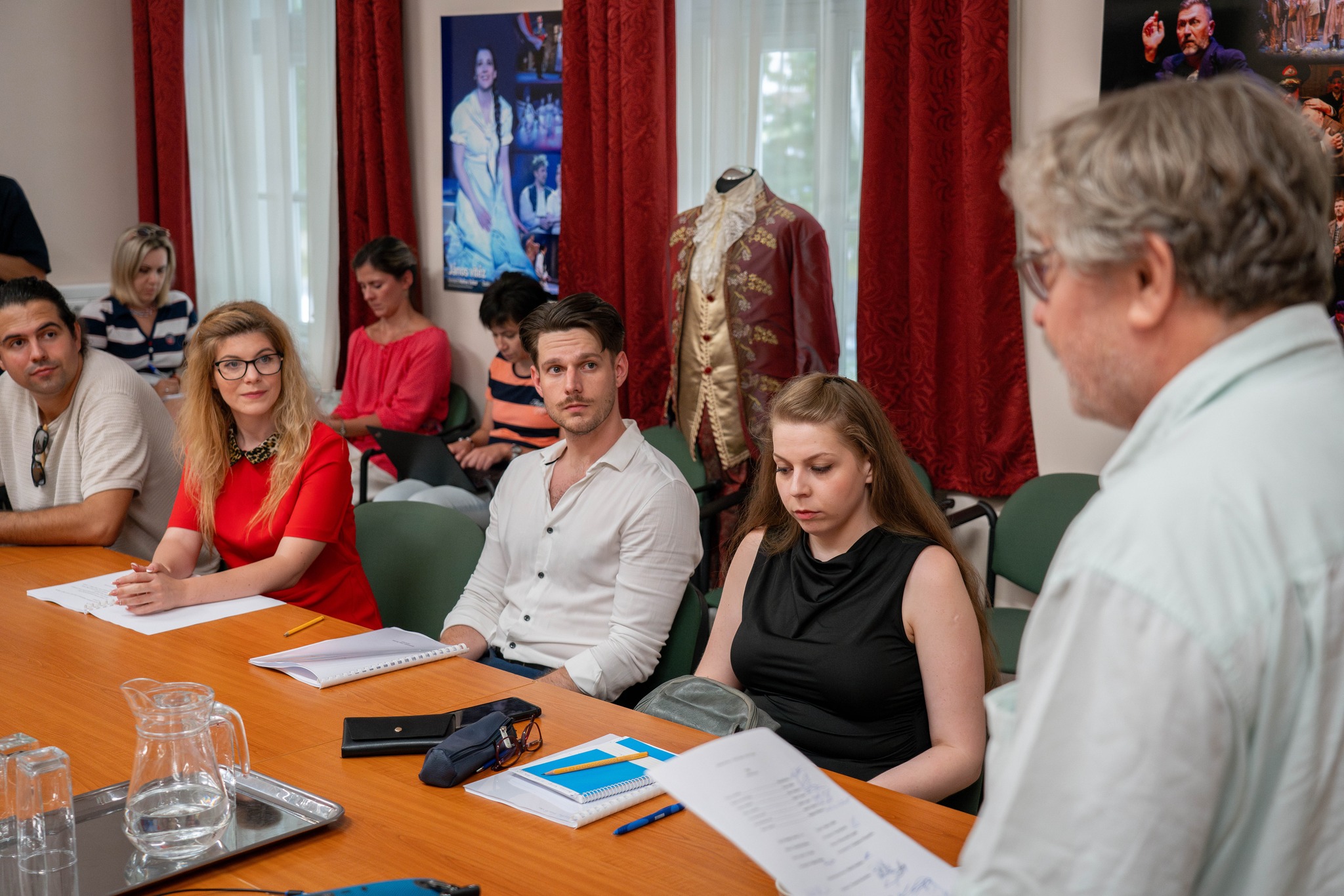 Lévai Attila, Szász Borisz, Kiss Viktória és Márki Szabina, valamint a szereposztást ismertető Seregi Zoltán direktor