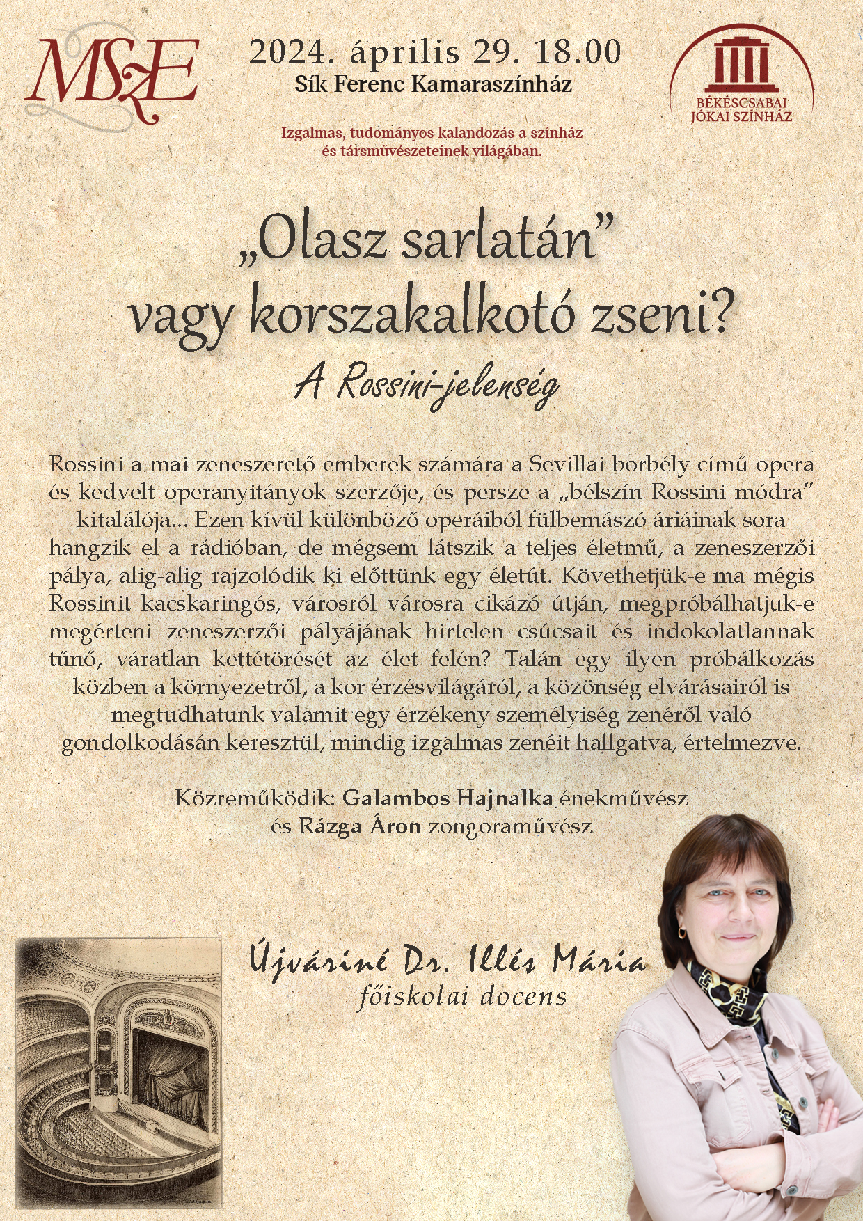 Ujváriné dr. Illés Mária főiskolai docens „a Rossini-jelenségről” beszél a színház- és művészetszerető közönségnek a Sík Ferenc Kamaraszínházban, Galambos Hajnalka és Rázga Áron közreműködésével.