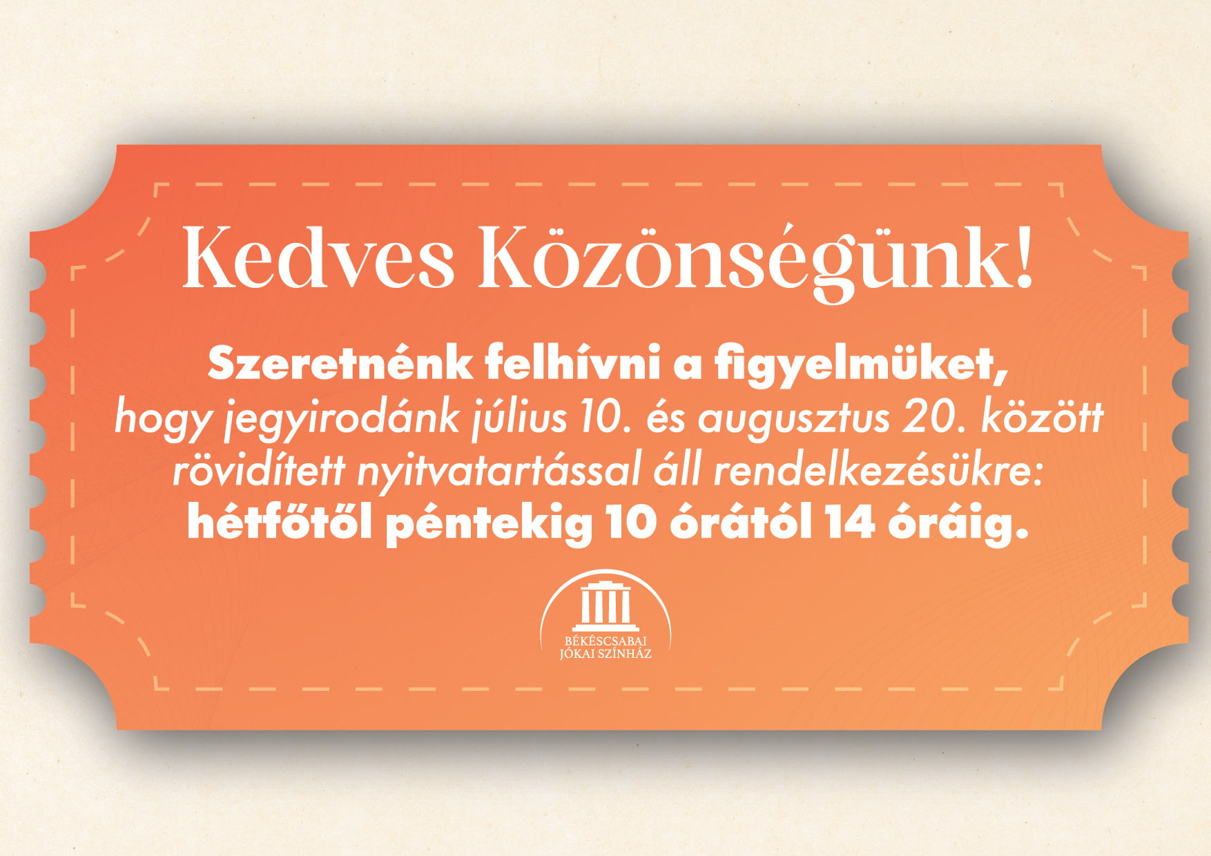 Július 10. és augusztus 20 között a nap legmelegebb óráiban térhetnek be hűvös jegyirodánkba, várják Önöket munkatársaink, akik készséggel adnak felvilágosítást a bérletekről, stúdióbérletről.
