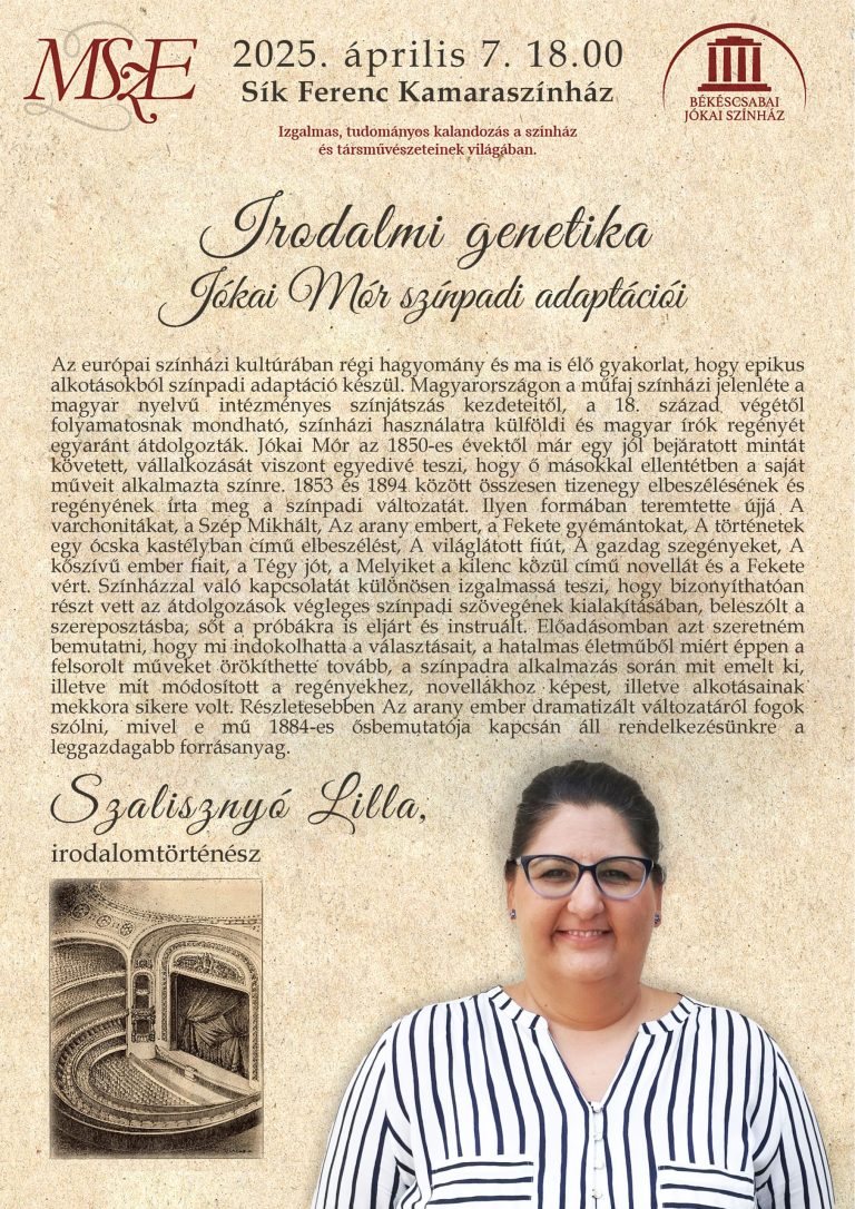 Irodalmi genetika – Jókai Mór színpadi adaptációi címmel Szalisznyó Lilla irodalomtörténész tart előadást a Mindentudás Színházi Egyetemén 2025. április 7-én 18.00 órakor a Sík Ferenc Kamaraszínházban