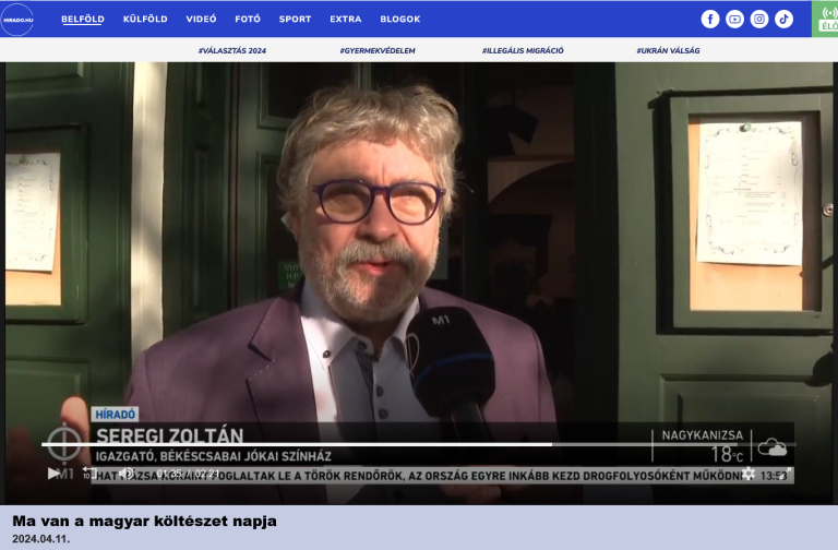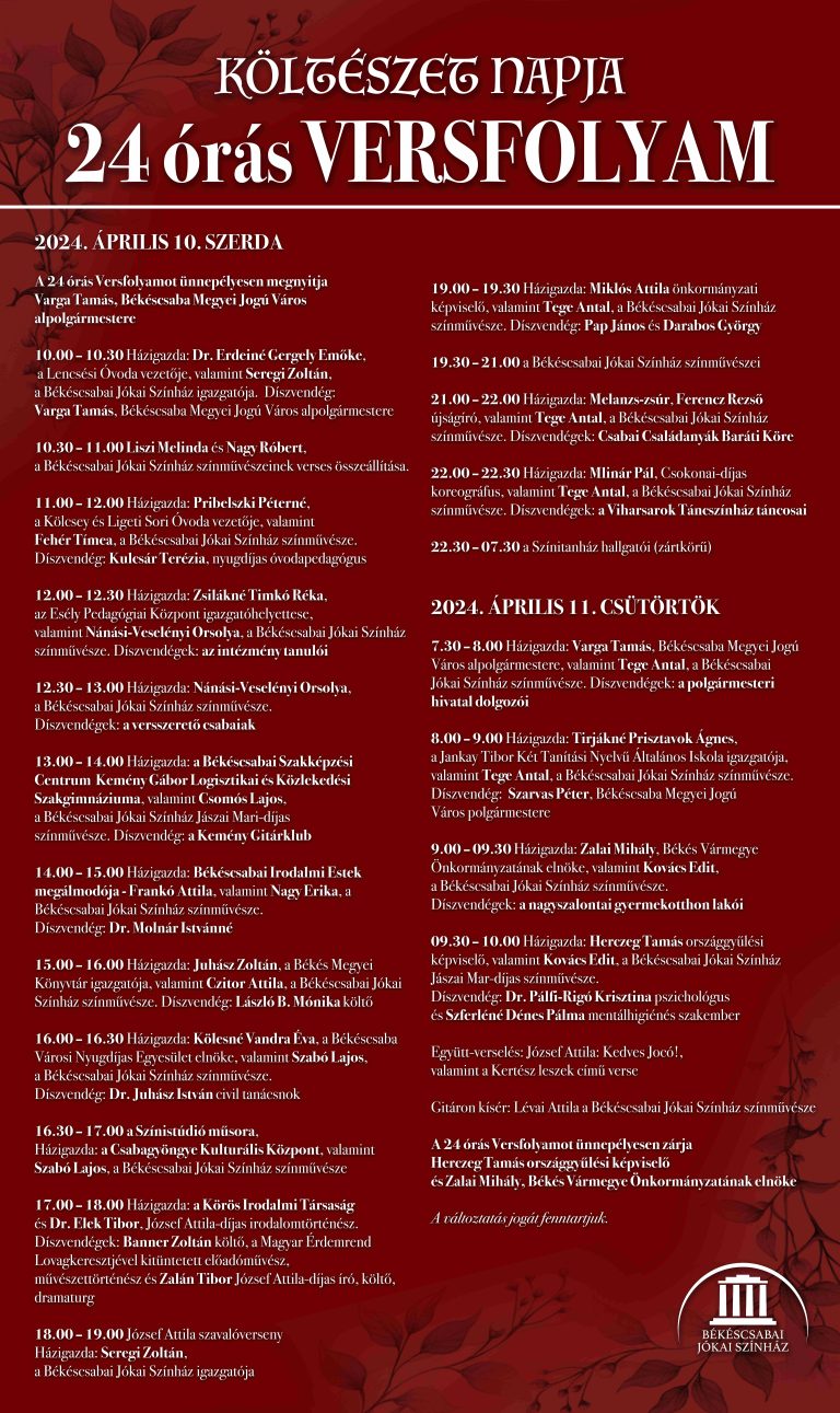 Gyula, 2024. április 8., hétfő (MTI) – Huszonnégy órás versfolyammal ünnepli a költészet napját a Békéscsabai Jókai Színház. Békés megyében több kulturális intézmény is készül programokkal az ünnepre.