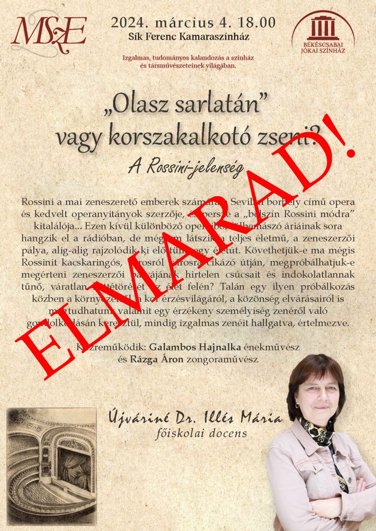 Újváriné dr. Illés Mária estje betegség miatt elmarad. Az esemény pótlásáról később gondoskodunk, és tájékoztatjuk kedves nézőinket.