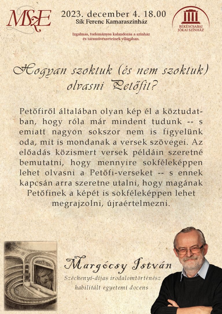 Előadás-sorozatunk következő darabjaként Margócsy István habilitált egyetemi docenset hallgathatják meg Petőfi Sándor költészetéről.
