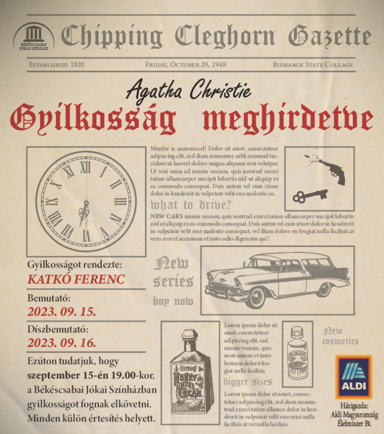 Gyilkosság meghirdetve – Agatha Christie egyik nagyszerű regénye foglalja el a Jókai Színház Nagyszínpadát, Katkó Ferenc rendezésében.