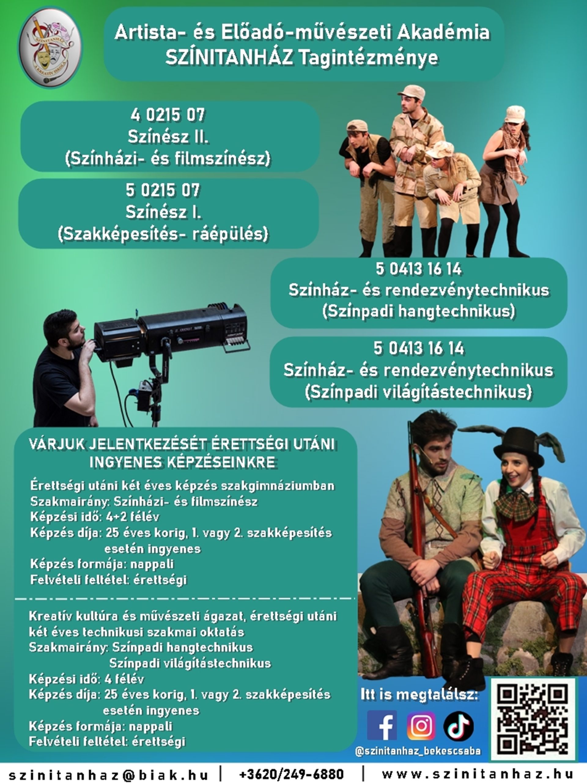 Érettségi után, államilag finanszírozott Színész, Színház- és rendezvénytechnikus képzésre várjuk a fiatalokat Békéscsabán 25 éves korig.