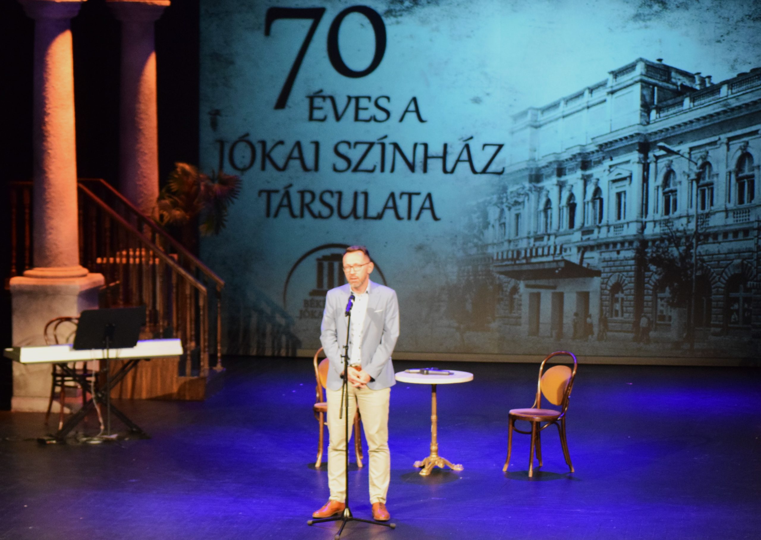 Az első színpadkép is rendkívül informatív volt: kivetítés tájékoztatott arról, hogy 70 éves a Jókai Színház társulata. Csaknem napra pontosan hét évtizede (szeptember 15-én) játszik állandó társulat Békéscsaba szívében.